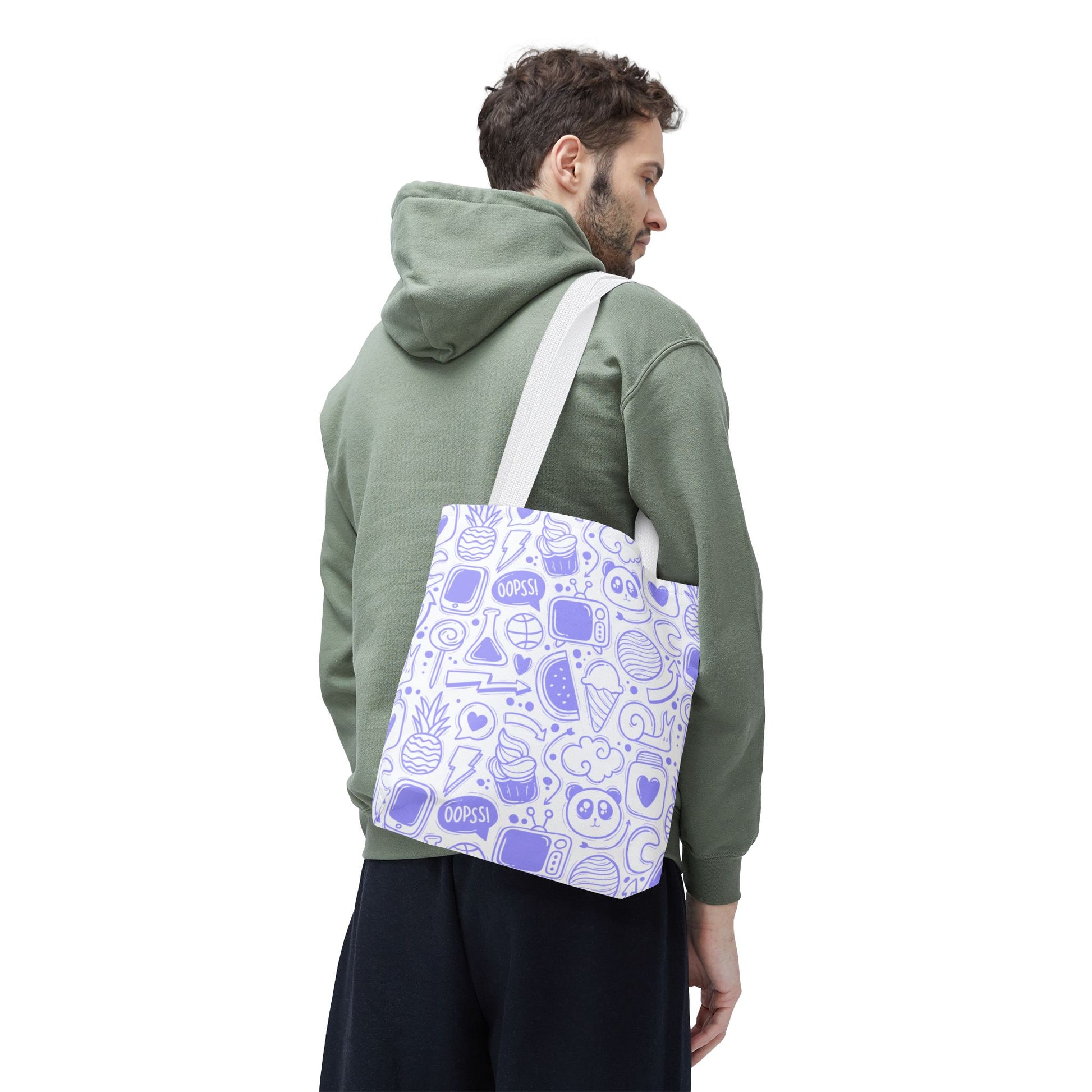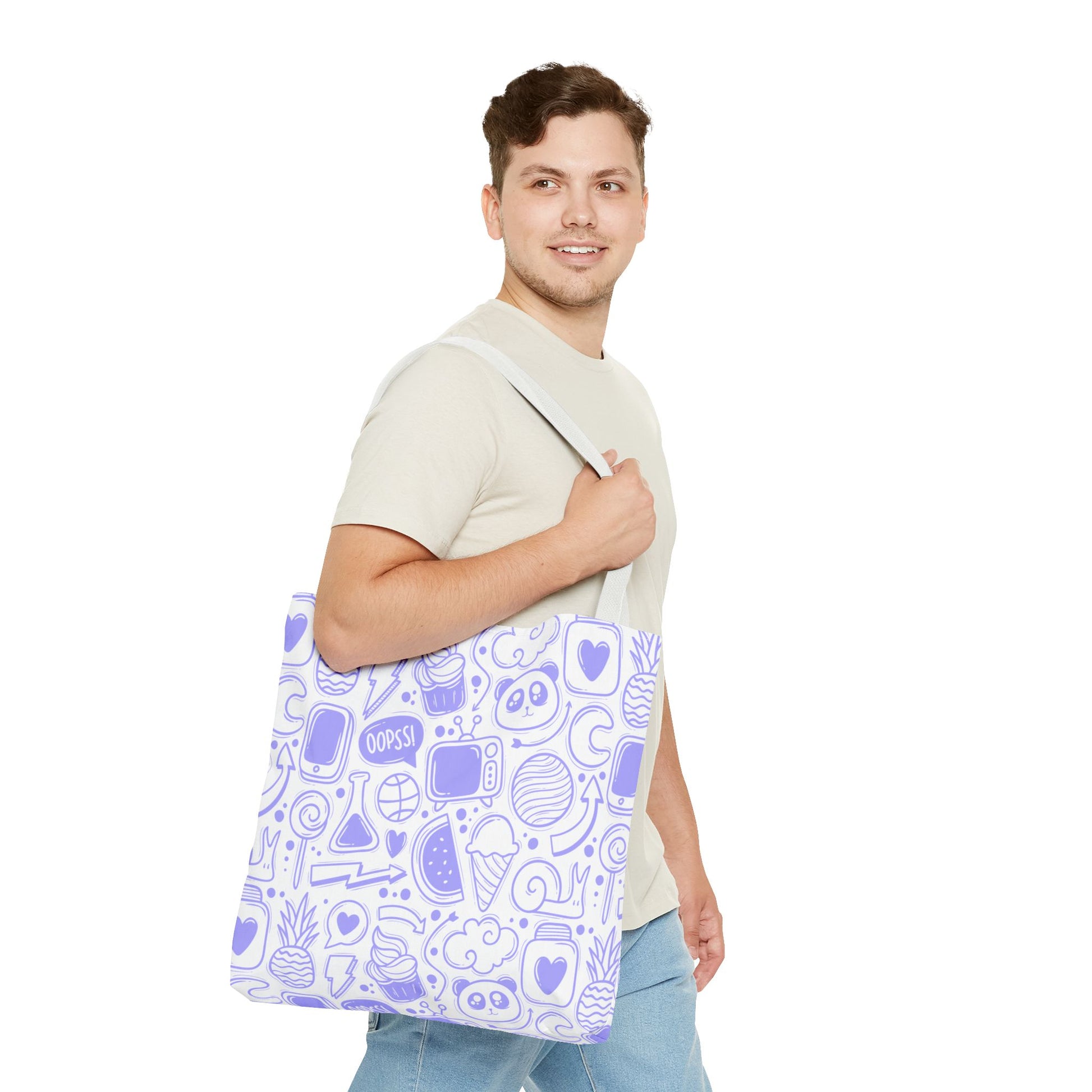 Available in 3 sizes to add both functionality and style, these custom-printed tote bags come with multiple handle colors to match your designs. Made with spun polyester, these bags feature double-stitched seams, cotton webbing straps, and nonwoven laminate lining for high-end durability. Your all-over print is created with dye sublimation for high-end visuals.