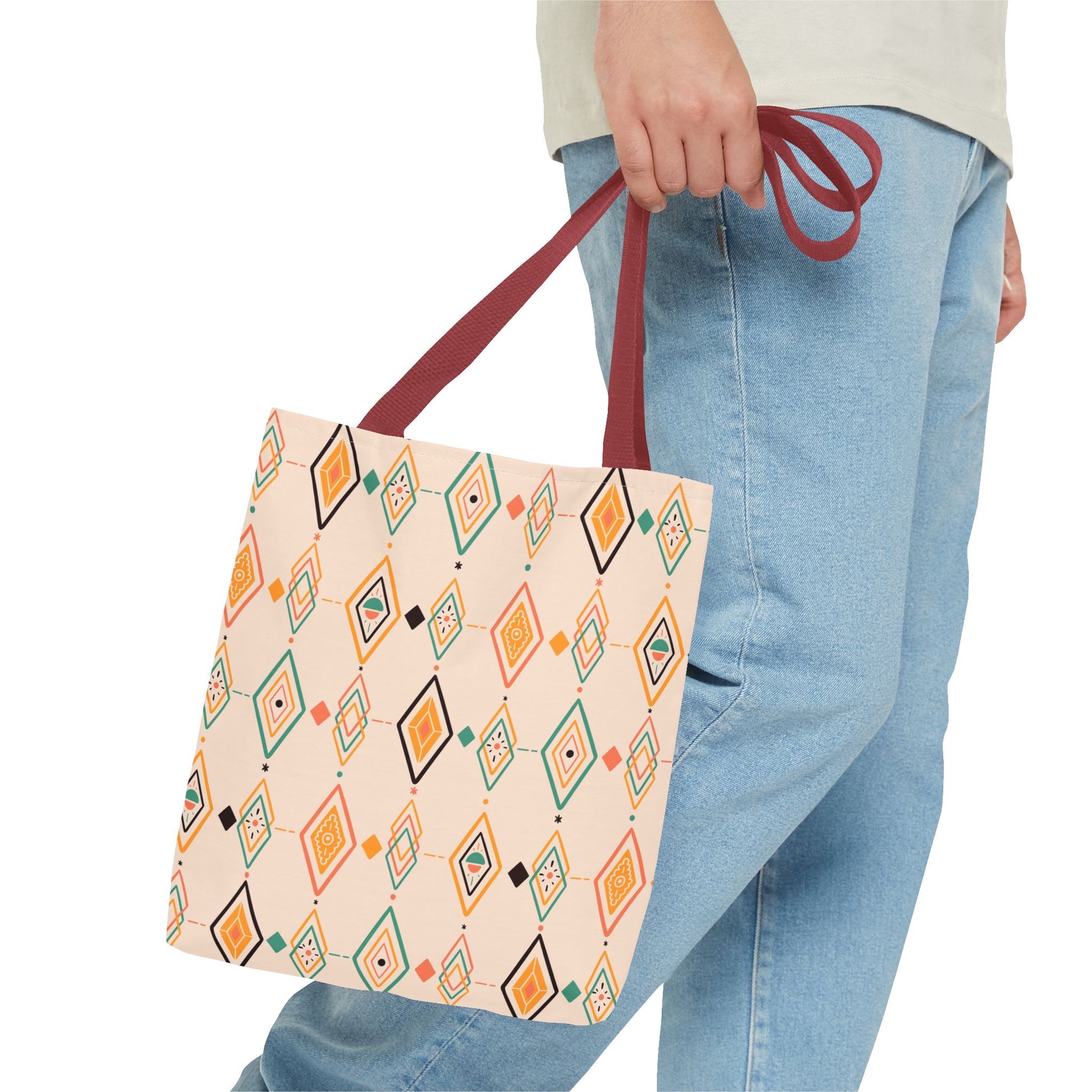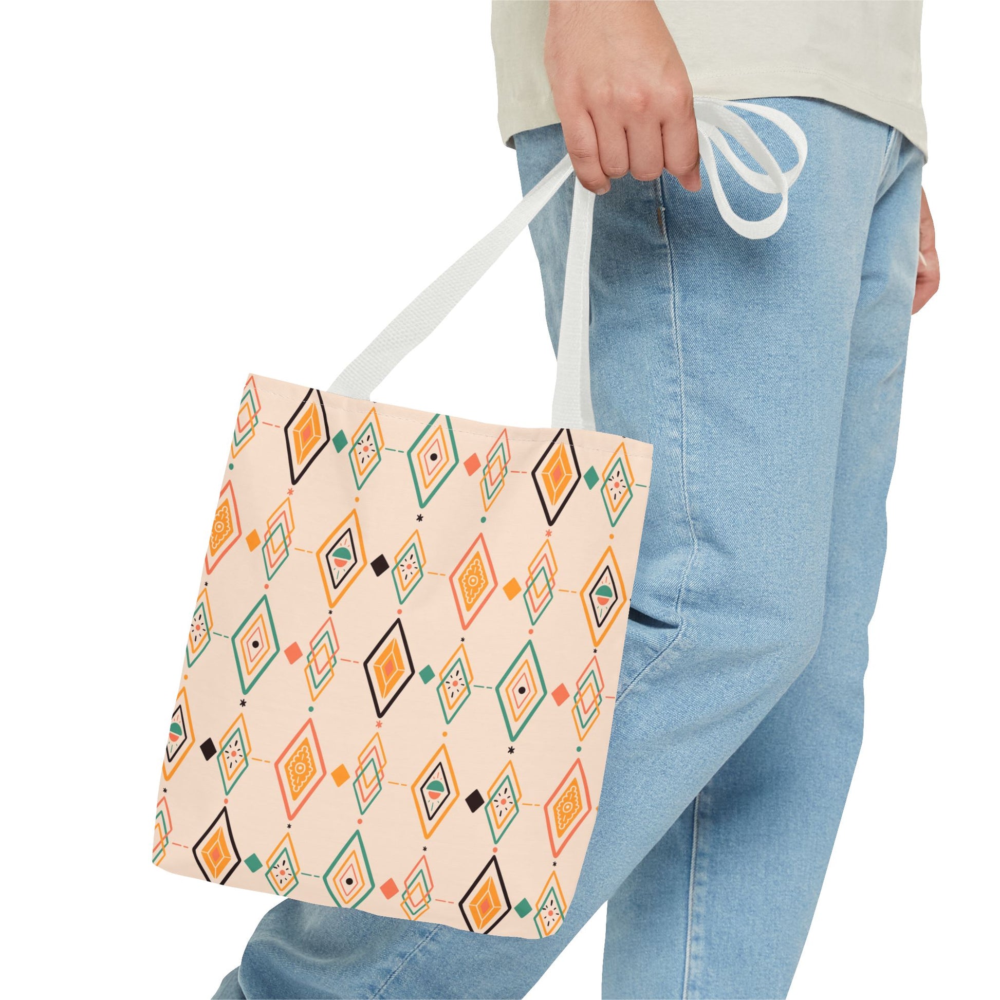 Available in 3 sizes to add both functionality and style, these custom-printed tote bags come with multiple handle colors to match your designs. Made with spun polyester, these bags feature double-stitched seams, cotton webbing straps, and nonwoven laminate lining for high-end durability. Your all-over print is created with dye sublimation for high-end visuals.